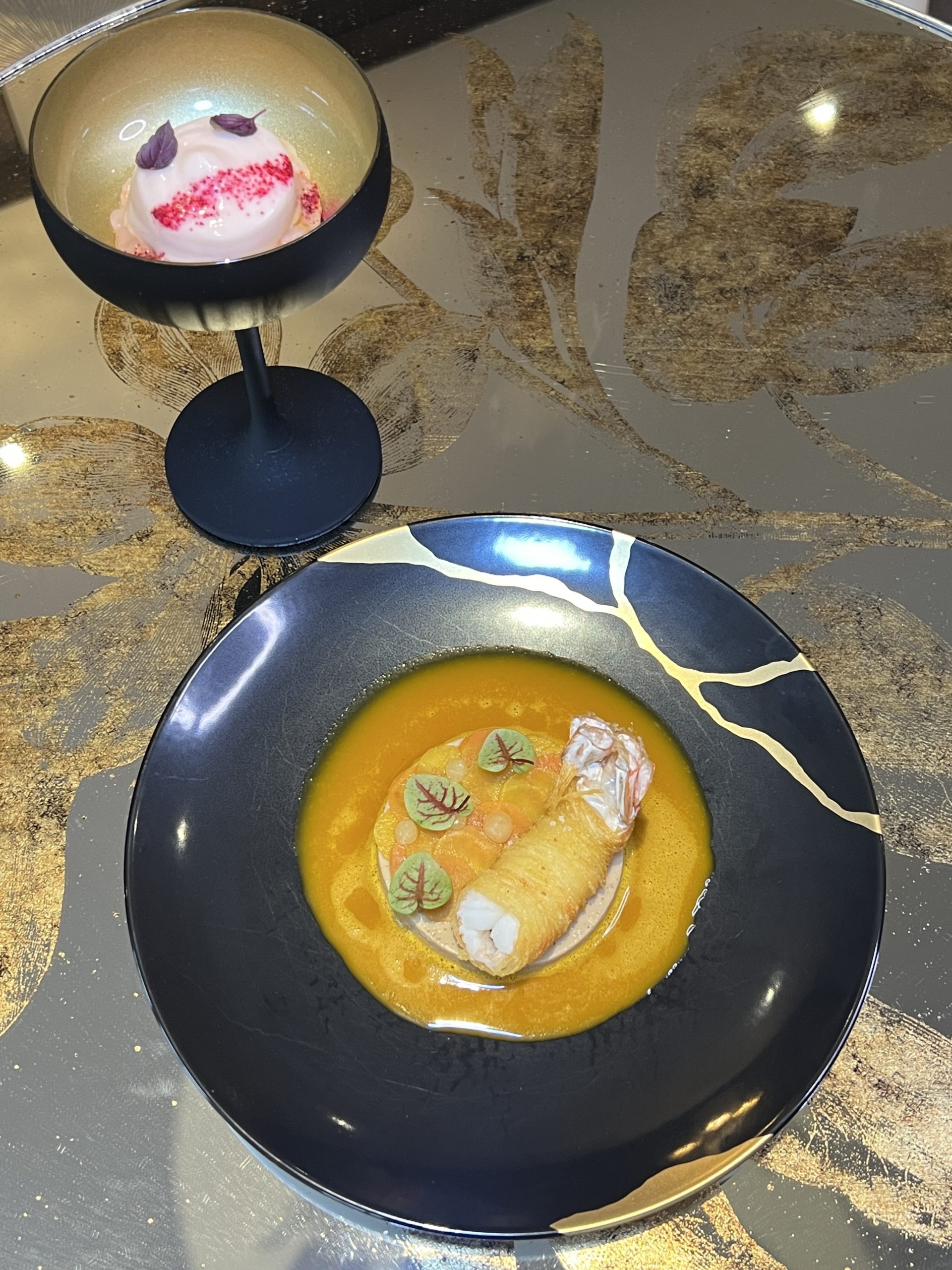 Julien Binz le décline au fil des saisons… Dans ce menu, entre deux plats, découvrez l’attention du chef qui se compose d’un jaune d’œuf confit. Déposé minutieusement sur du quinoa grillé à la poêle, apportant quelques notes torréfiées ainsi que des oignons revenus dans du beurre. Au dessus, un siphon de maïs et des chips de maïs parsemées sur cette surprise gourmande que le chef sublime avec un spray de truffes blanches. Cet entre-plat se cache dans un œuf élégant et raffiné, « Jaune de Chrome » en porcelaine de Limoges.