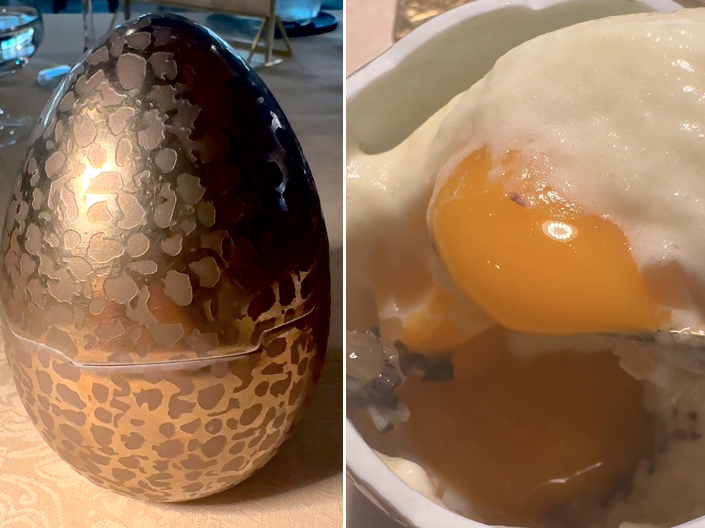 Au moment du dressage, se dépose au centre de l’assiette un élégant cylindre de pommes de terre, une compotée d’oignons et de truffes au beurre. Surplombant le tout, un jaune d’œuf cuit à 63° entier dans sa coquille, puis confit. Un siphon de pommes de terre vient ensuite le recouvrir.