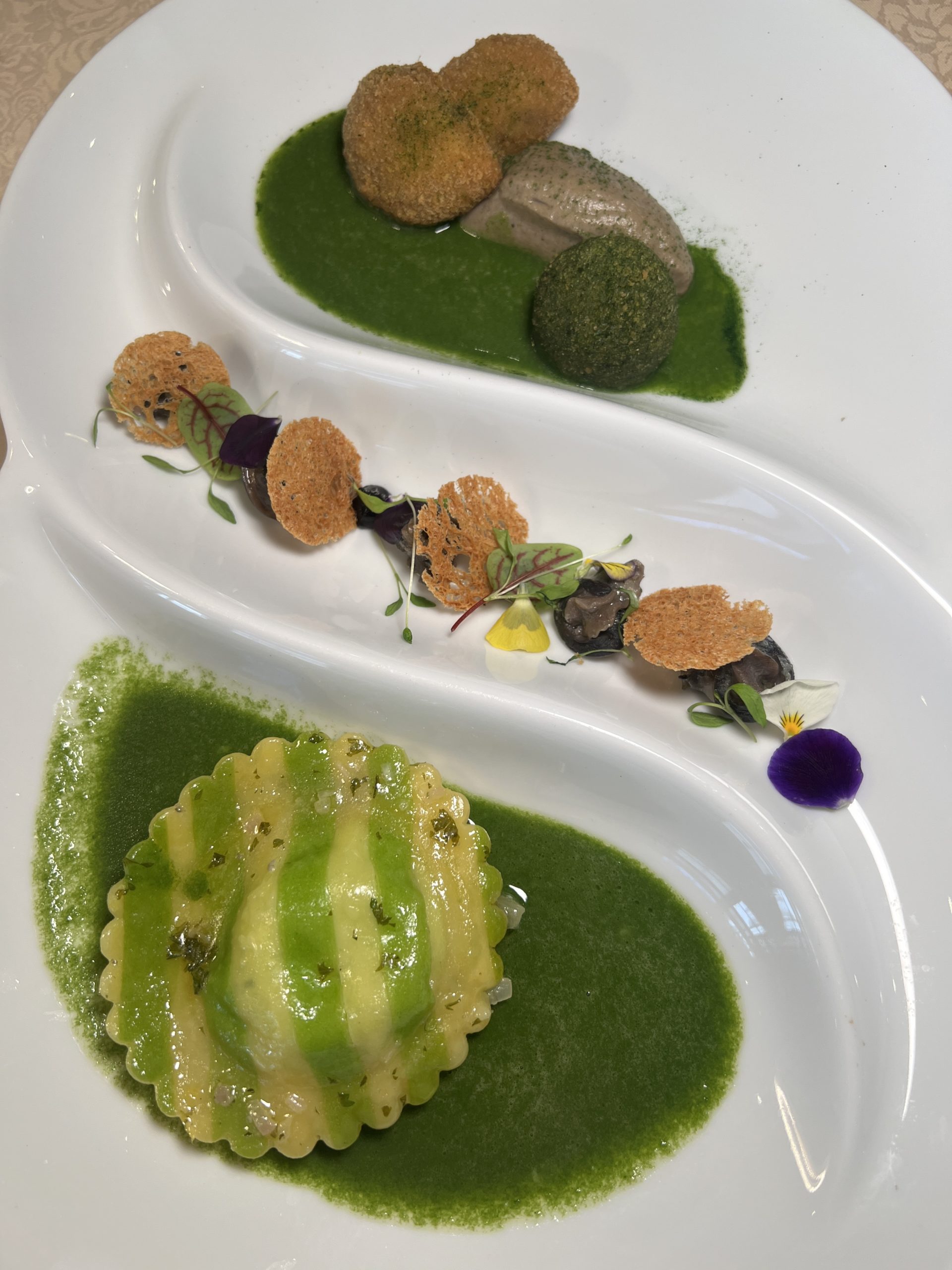 L’onctuosité du jaune d’œuf confit à 64°, déposé sur une compotée d’oignons, est sublimé par la truffe. Il est coiffé par un siphon de pomme de terre généreusement enrobant et le chef invite à bien plonger la cuillère au fond pour déguster l’ensemble de la préparation.