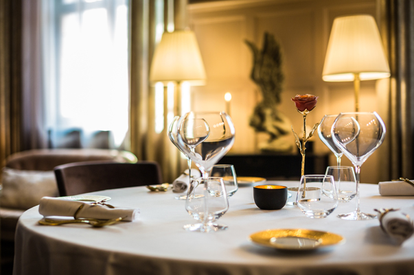 Dans les deux salles, les arts de la table ajoutent de la préciosité et du raffinement pour faire de chaque repas un instant unique. Nappage blanc, assiettes en porcelaine de Limoges, matériaux nobles, couverts martelés, élégantes verreries, lampes de tables recouvertes de feuilles d’or, rose éternelle de chez Daum, l’élégance se niche dans les moindres détails.